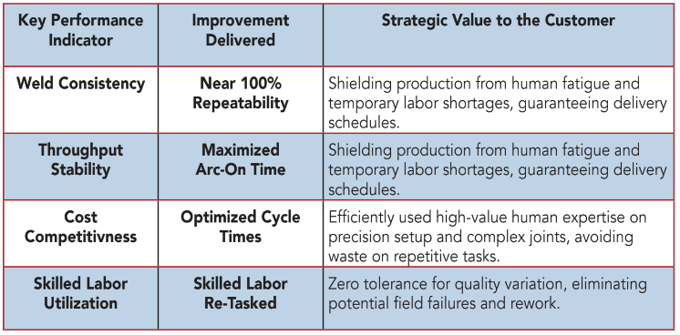 - Cost & Labor Risk: Relying solely on manual welding introduced the risk of inconsistent cycle times and exposure to skilled labor shortages, threatening the competitive pricing required for the contract.